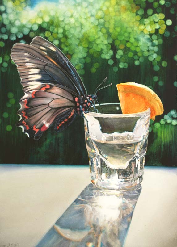 I gradually darkened the butterfly and glass shadows, and lightened the citrus wedge by rewetting and lifting off color. Slightly darkened some of the light areas of the table to make that refracted highlight look whiter than white.
